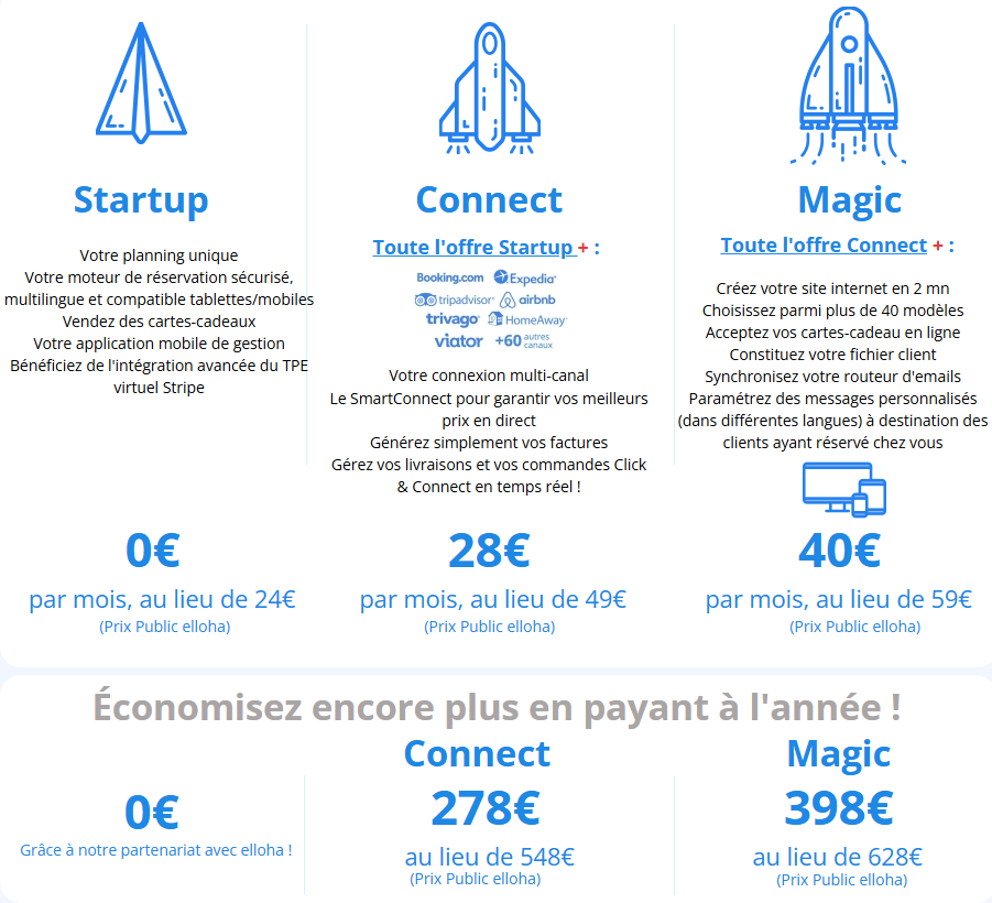 - Elloha adapts to all type of activity (accommodation or leisure services) and is non-binding. You are free to change formulas or leave the solution at any time.