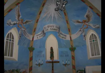 In 1990, the interior was frescoed with scenes of rural life and landscapes by local painter Elie Murat. A large blue painting of Christ surrounded by angels with the inscription "Christ is risen, all be his witnesses" is simply splendid.