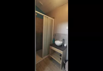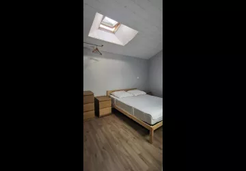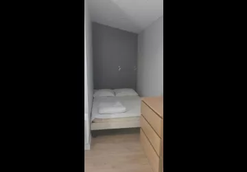 One bedroom with two double beds separated by a curtain, a chest of drawers and a closet. Fiber-optic Internet access available.