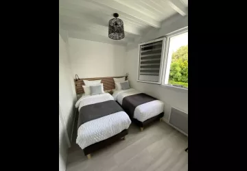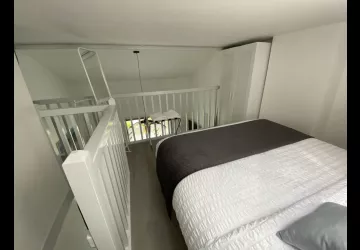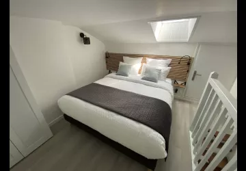 There's a ground-floor bedroom with two 80 x 200 beds and a closet, and a mezzanine with a 160 x 200 bed and a wardrobe.