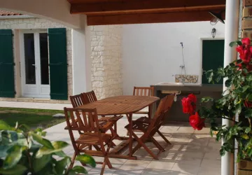 Private parking for 2-3 cars, with a plug for charging an electric car. Small garden with stone table and benches in front of the house. Back garden with covered terrace with wooden table and chairs and summer kitchen. Garden furniture, parasol, charcoal barbecue and electric barbecue. Garage and enclosed garden. Outside shower.
