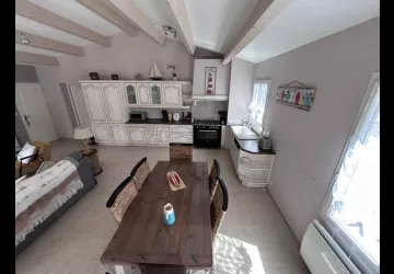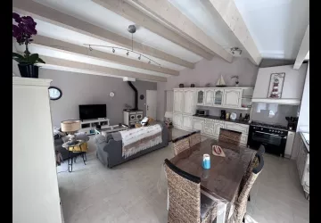 It comprises a large, bright 43m2 kitchen/dining/living room with exposed beams.