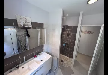 3 bedrooms, 2 with 140cm beds and one with 2 90cm beds. Bathroom with double sinks, walk-in shower and heated towel rail. Separate WC, 1 garage with washing machine and water softener, ideal for sensitive skin.