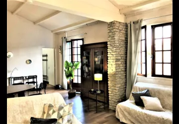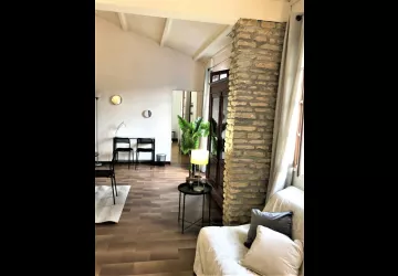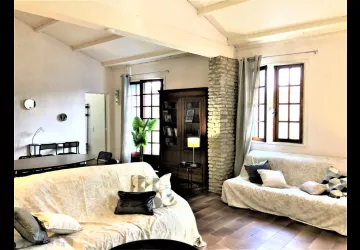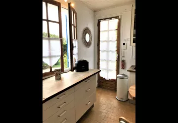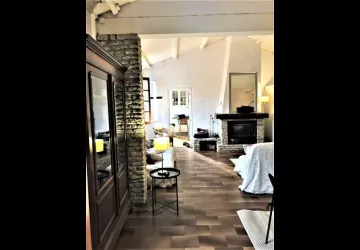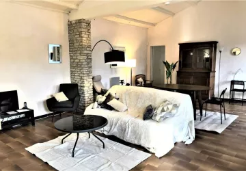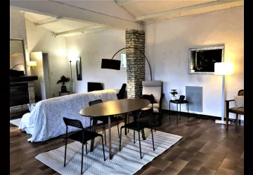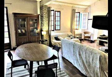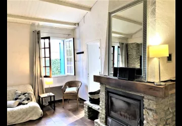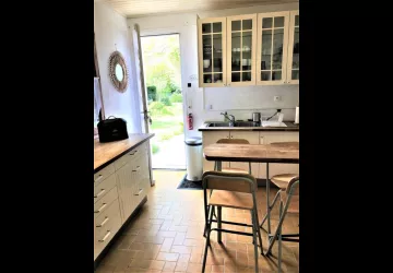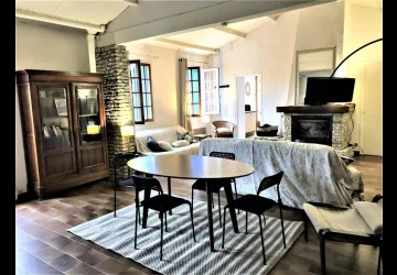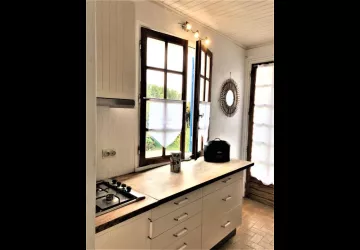 While the house is centered on the very large living/dining room (with cathedral ceiling and part of the exposed framework, but also - and notably - modern audio/video equipment), it nevertheless opens onto the fitted/equipped kitchen, the terrace (with garden furniture and deckchairs), and the garden/garden... on the other, onto the two bright and very pleasantly appointed bedrooms (one of which has a cot and baby chair).