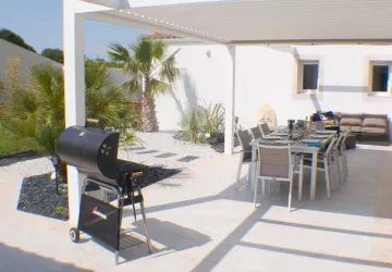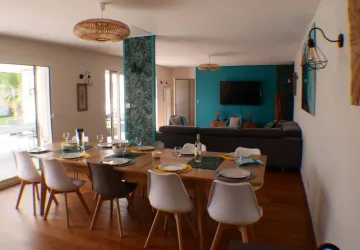 Located in a very quiet residential area of the Village of Sauzelle, 3 minutes from La Gautrelle beach, our single storey Villa welcomes you to a world of comfort and quality on 165 m² and a beautiful equipped garden (American barbecue, deckchair, outdoor games for children, outdoor shower, etc.) over 450m². In the center, a landscaped patio with a tropical look, an outdoor living space for conviviality and relaxation: a bioclimatic pergola, an outdoor lounge, a large modular table for 6 to 12 guests.